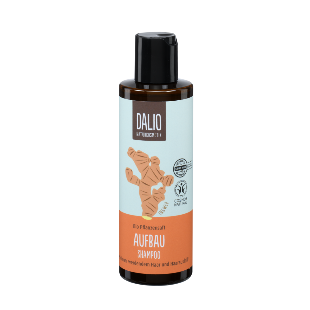 Das DALIO Aufbau Shampoo mit dem natürlichen Wirkstoffkomplex aus Bio Coffein und Bio Ingwer stimuliert die Haarwurzel von kraftlosem, dünner werdendem Haar.